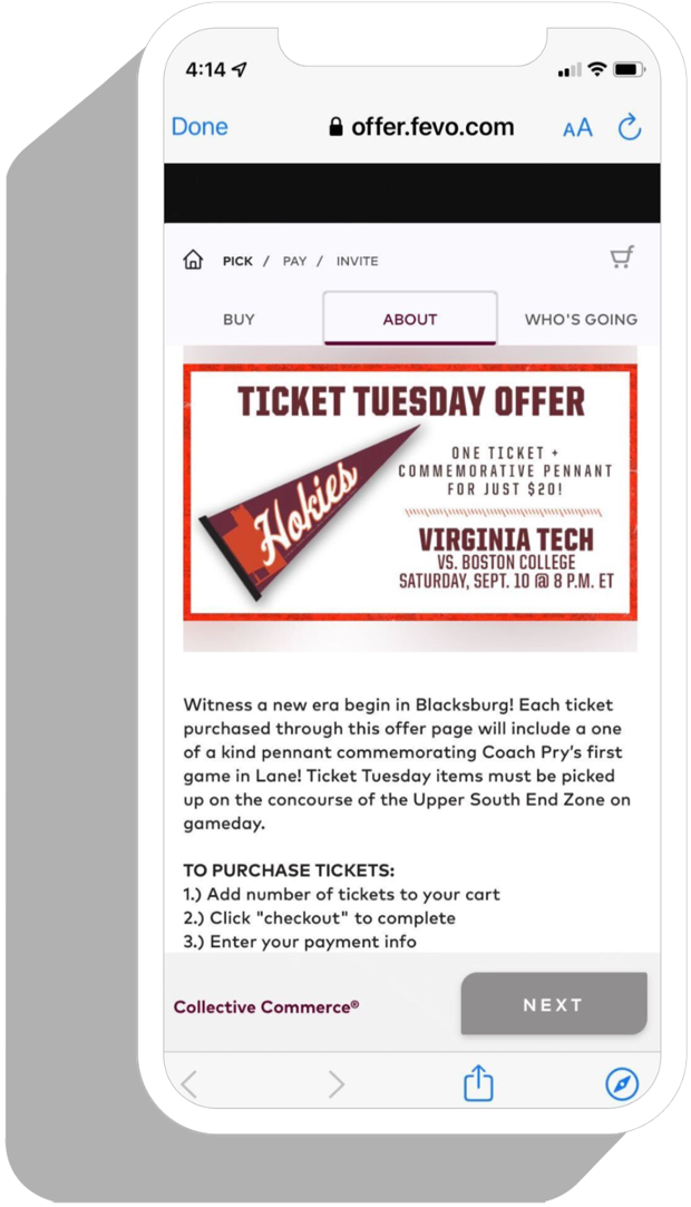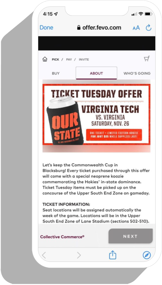 Our Ticket Tuesday offers helped us sellout the Upper South Endzone for all six of our home football games this season. Combining Virginia Tech’s efforts with FEVO’s platform, we were able to effectively reach more of our fanbase and make a huge difference in our in-venue experience.